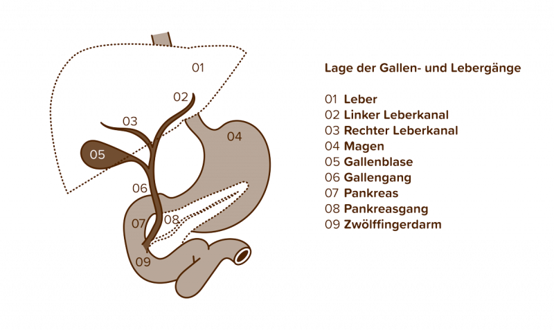 Die Katze hat eine anatomische Besonderheit: Das Ausscheidungssystem besteht nur aus dem Hauptpankreasgang, der in den Gallenblasengang (Choledochus) mündet, bevor er an der Papilla duodeni major in den Zwölffingerdarm (Duodenum) mündet.
